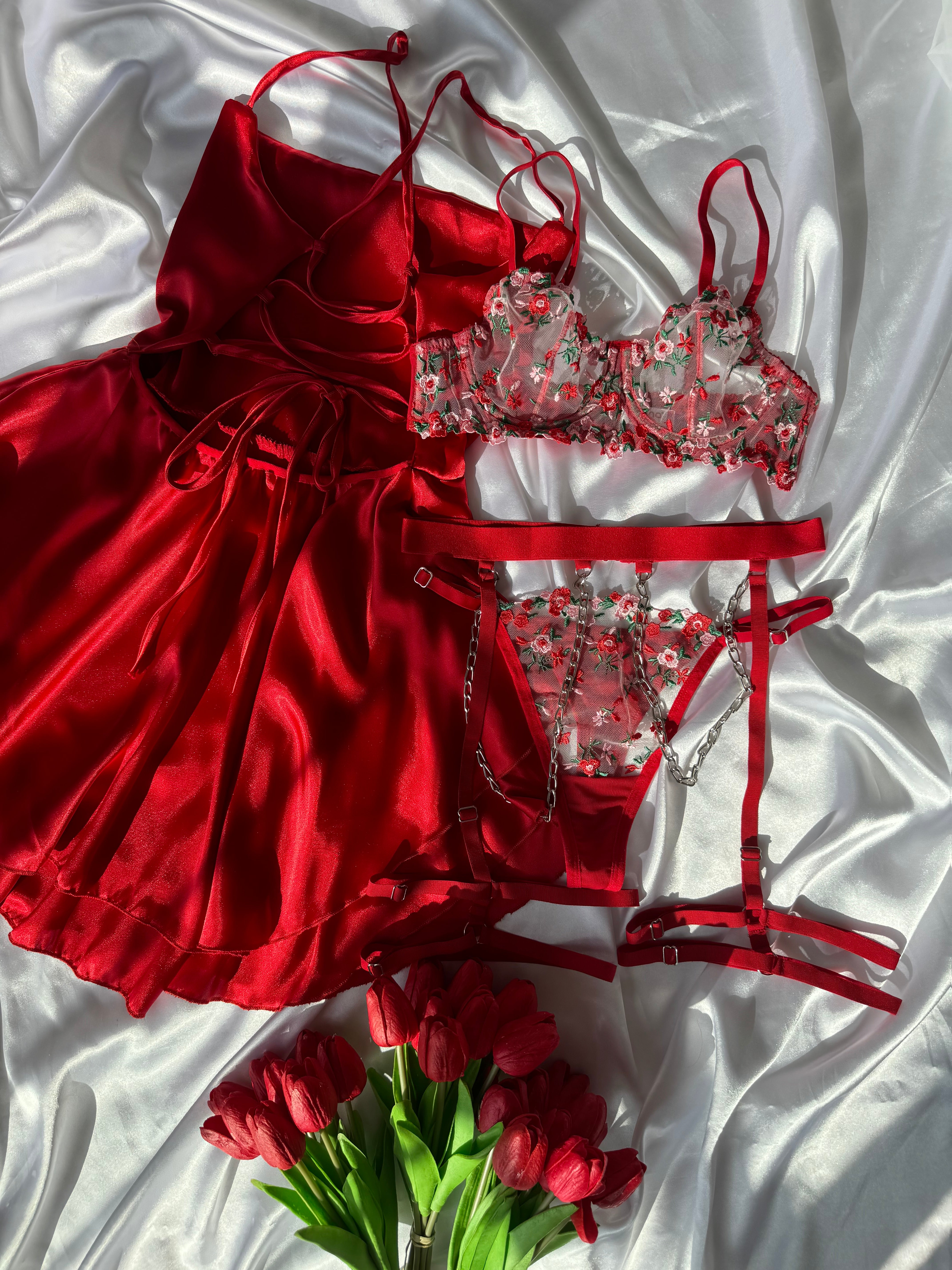 Kırmızı dantel jartiyer seti, uyumlu tanga & üst parça, ayarlanabilir jartiyer bantları, yumuşak ve esnek kumaş yapısı, vücudu estetik şekilde saran zarif form, hafif ve rahat kullanım, tam kalıp – kendi bedeninizi tercih edebilirsiniz, elde yıkanabilir ve uzun ömürlü kullanım.