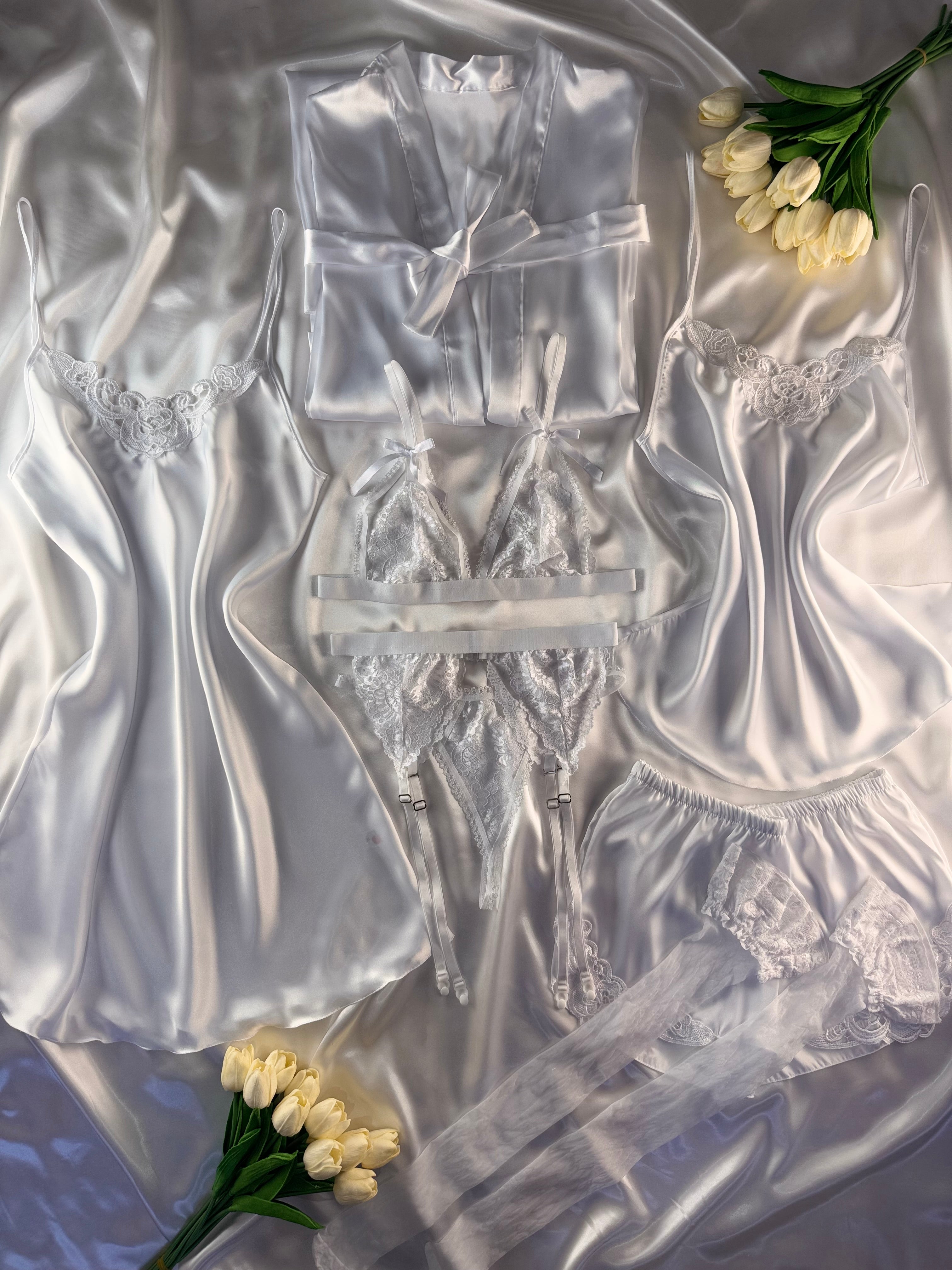 Elegant 10 Parça Ekru İpek Saten Set – Özel Kutulu & Jartiyer Hediyeli Lüks Paket | Madame Mercy