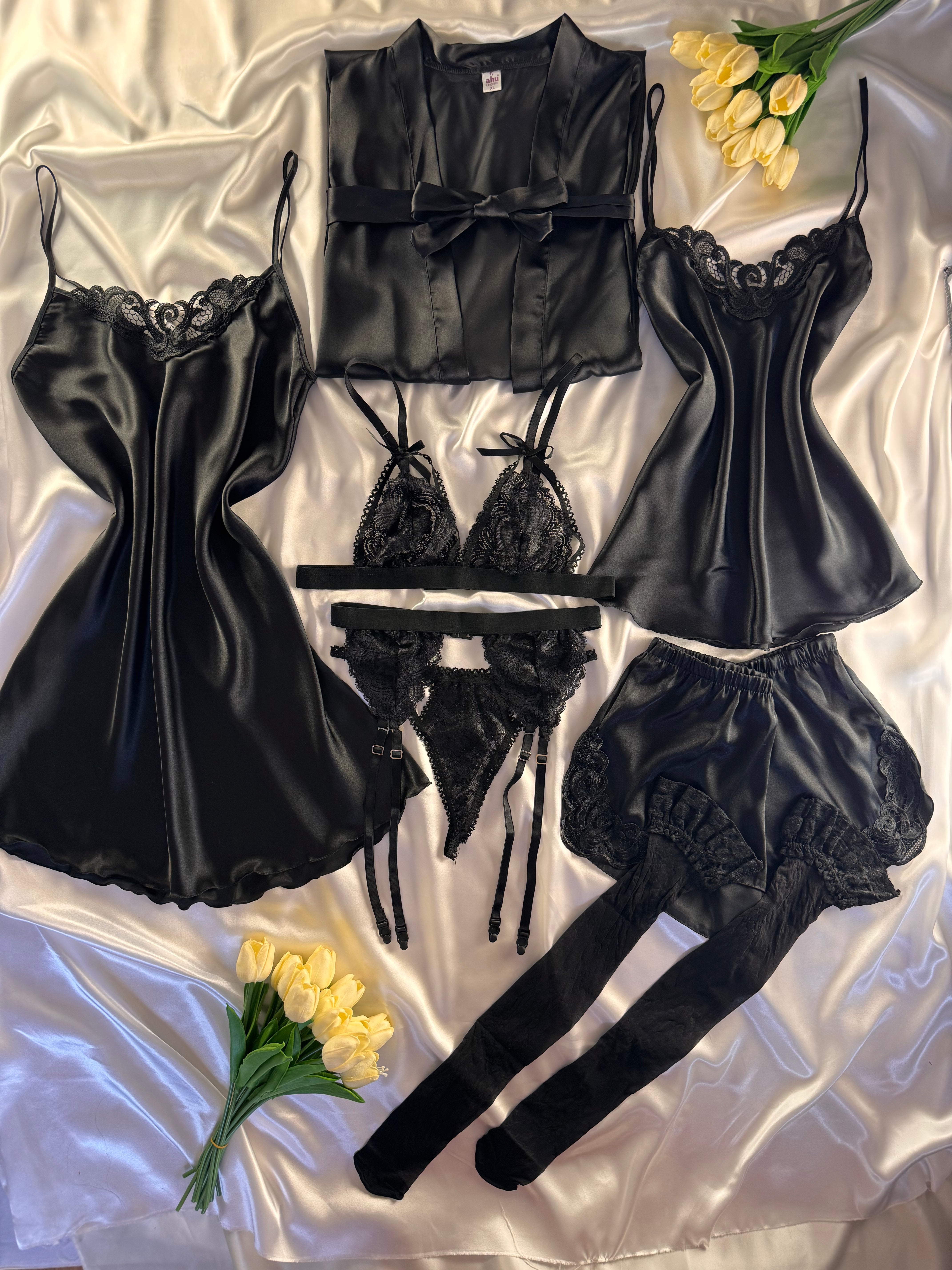 ✨ Black Diamond 10 Parça İpek Saten Dev Set – Özel Kutulu & Jartiyer Hediyeli Lüks Paket, siyahın asaletini ipek satenin lüks dokusuyla birleştirerek kusursuz bir premium hediye veya kişisel şıklık deneyimi sunar.