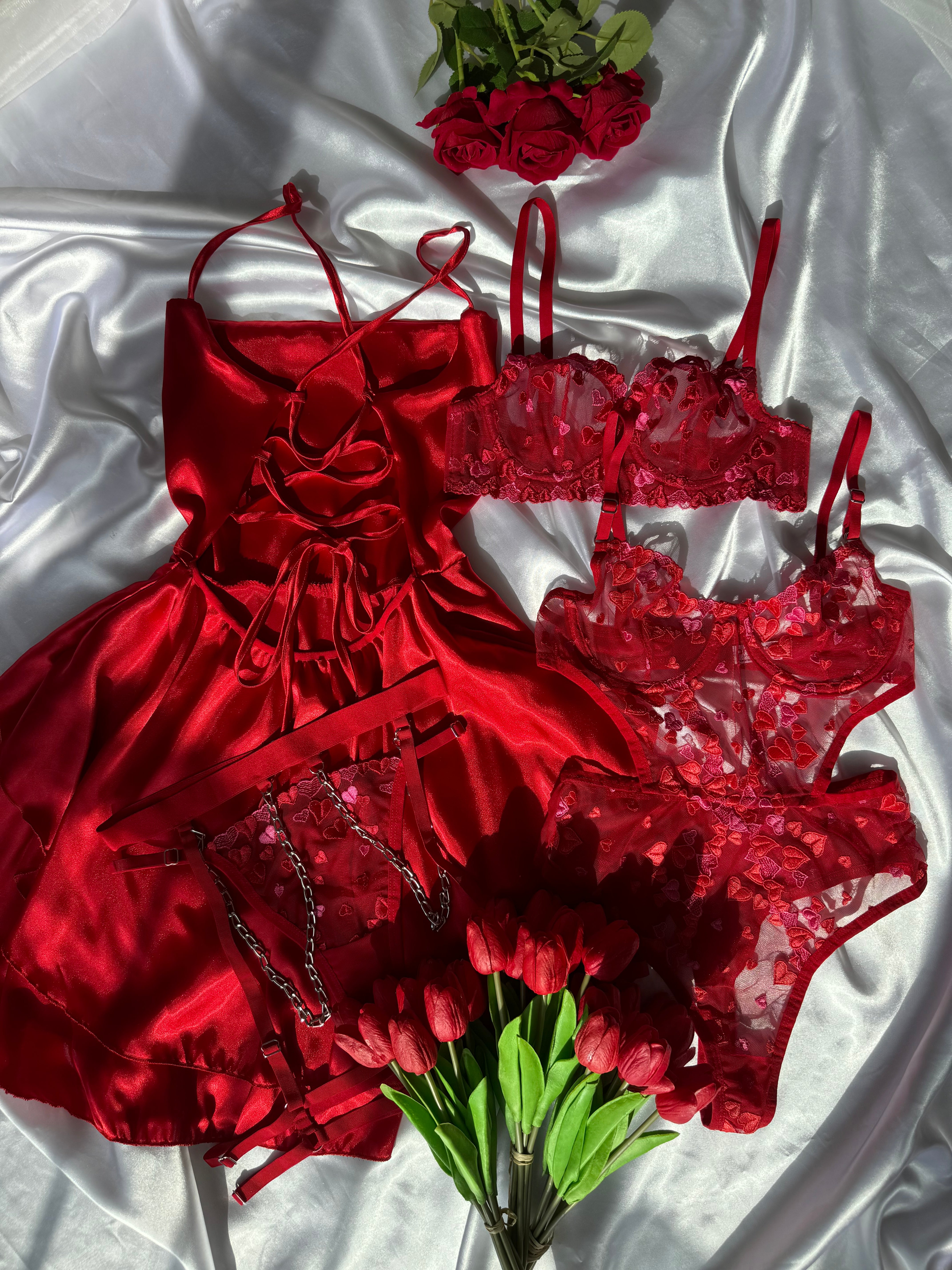 Heart Love 7 Parça İpek Saten Kırmızı Kalpli Set – Özel Kutulu & Bralet Hediyeli Lüks Paket