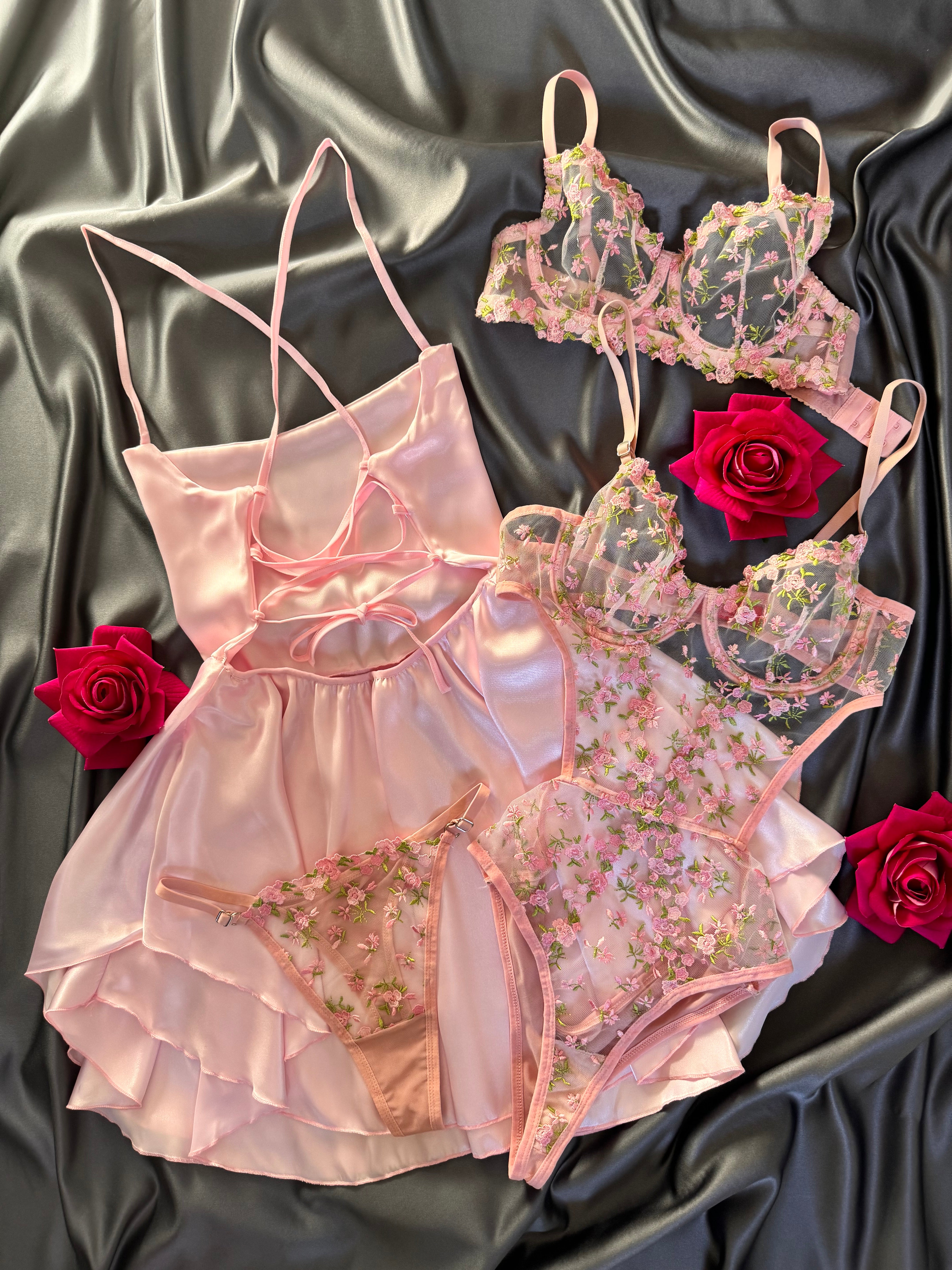 İpeksi parlak dokusu ve romantik volan detaylarıyla öne çıkan bu özel set, hem şık hem de kullanışlı parçalarıyla her anınıza zarafet katıyor. Setin içinde yer alan bralet takımı ve hediye bodysuit, kombini daha da avantajlı ve tamamlayıcı hale getirerek tek pakette çok yönlü kullanım imkânı sunuyor. Özel günlerde, balayı kombinlerinde, şık davetlerde veya kendinizi iyi hissetmek istediğiniz her anda mükemmel bir seçimdir.