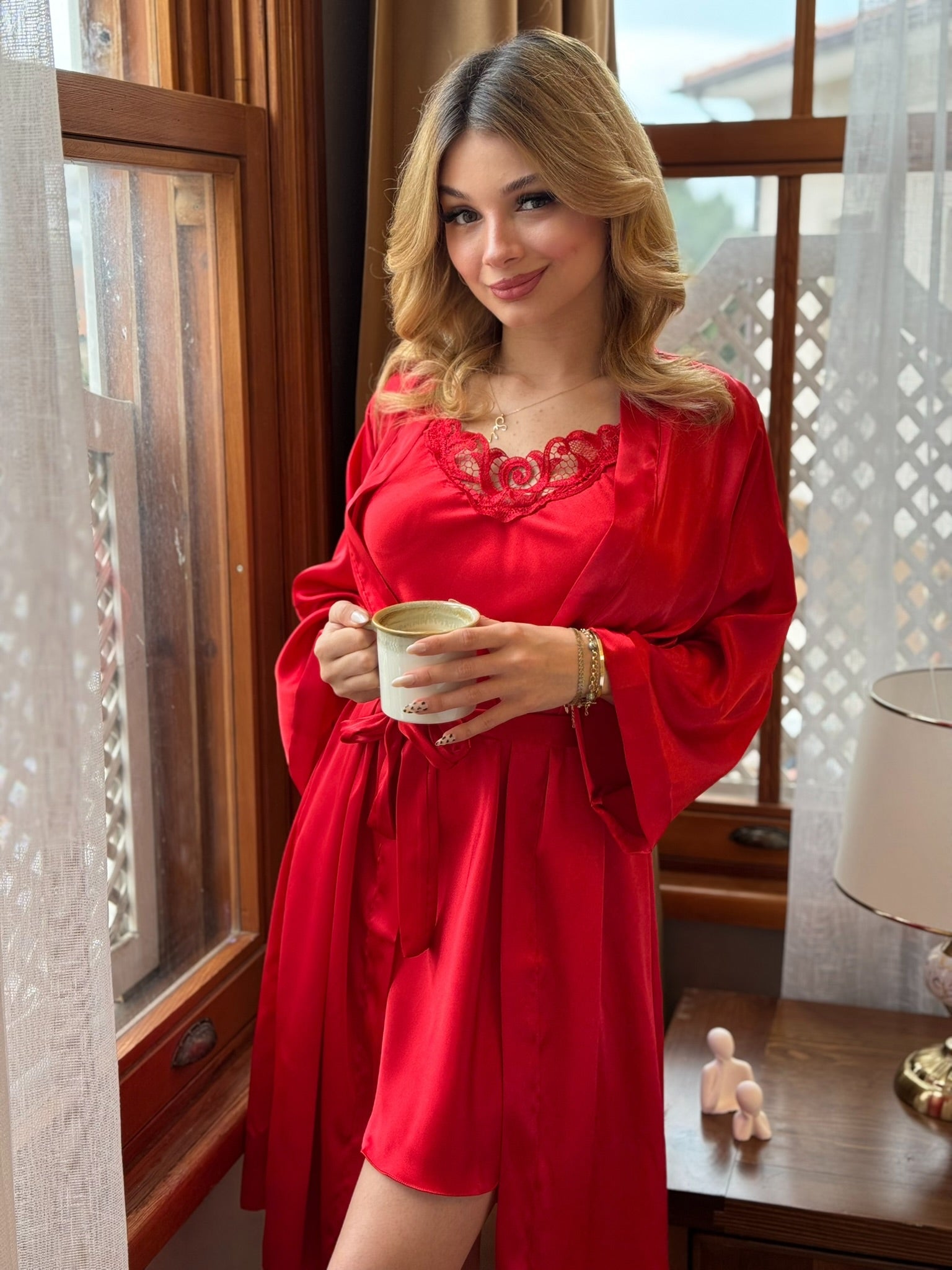 Romantik, elegant ve özel hissettiren bu zarif sabahlık; özel günlerde, ev şıklığında veya hediye olarak mükemmel bir tercihtir.