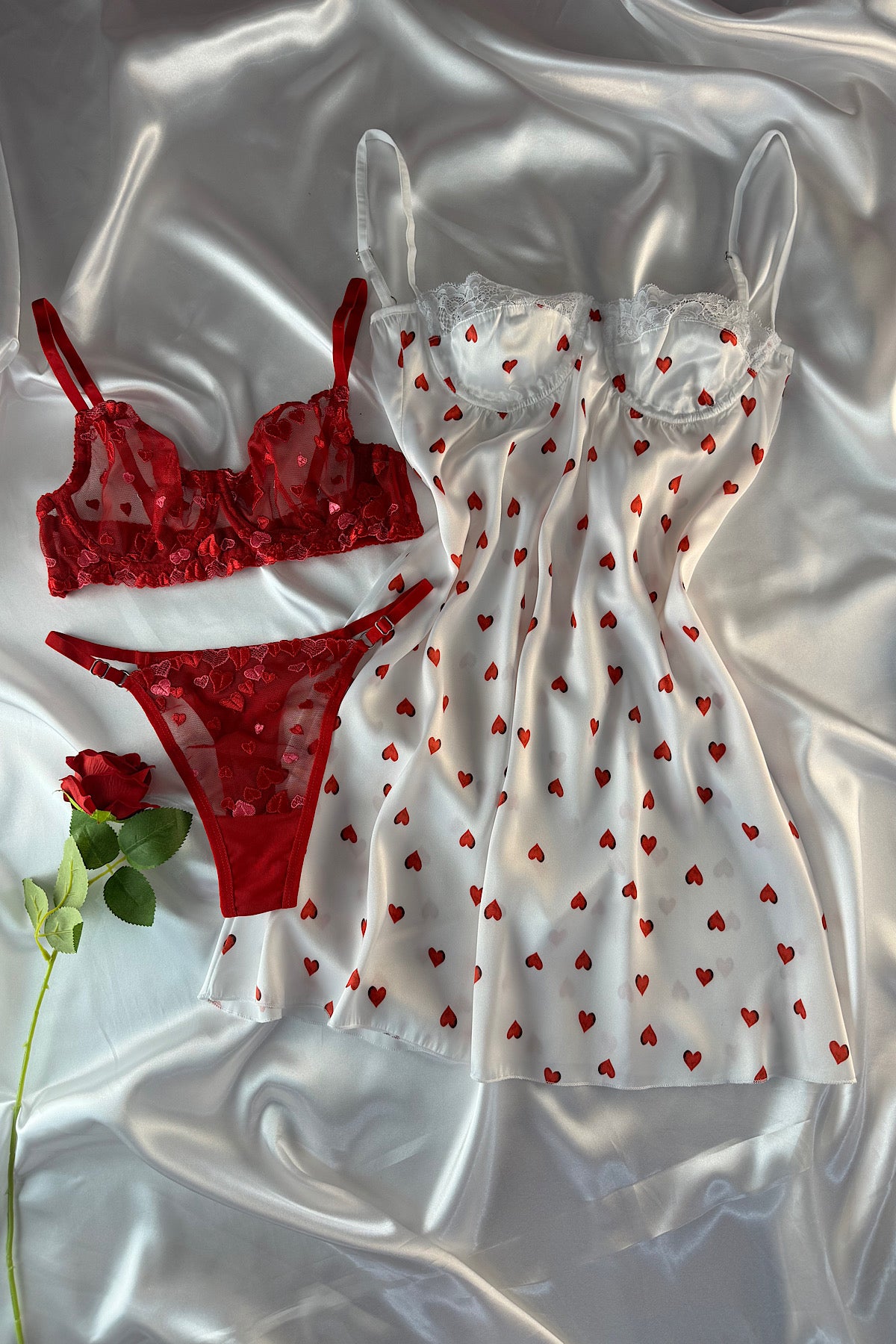 Kırmızı Kalpli 3 Parça Set – Zarif Elbise ve Bralet Takımı