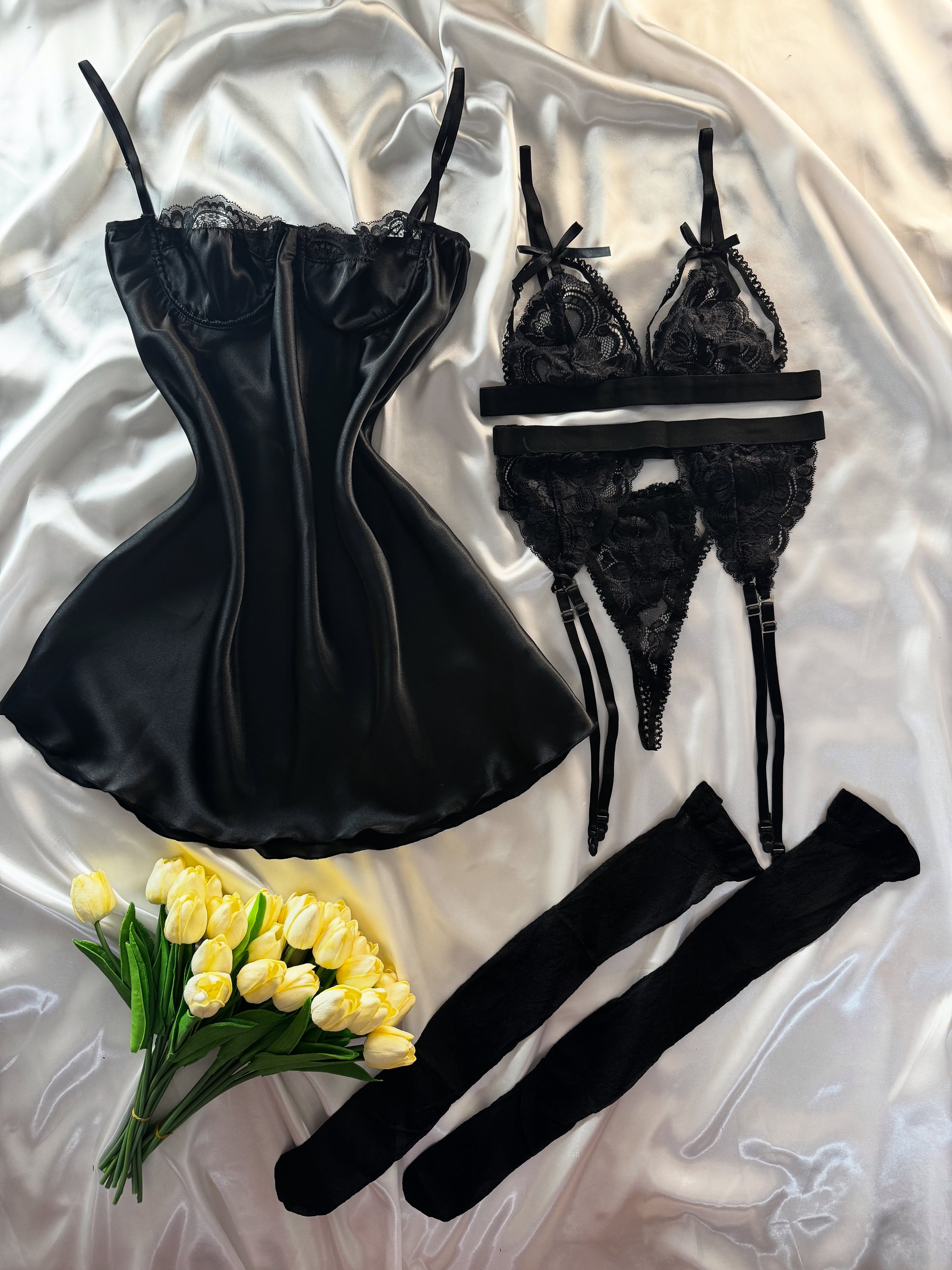 🖤 Siyah Balenli Göğüs Kaldıran Set (Çorap Dahil), seksi ve zarif görünümü bir arada sunarak özel anlar için mükemmel bir tercih oluşturur.