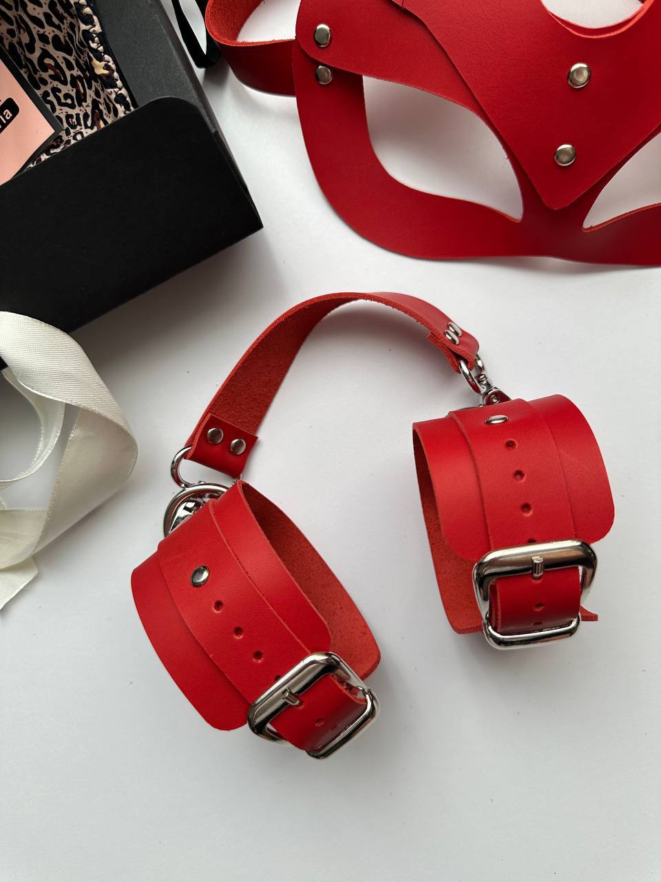 Kırmızı deri görünümlü maskeyle etkileyici tasarım, ayarlanabilir metal detaylı kelepçeler, sağlam bağlama kayışı, yumuşak iç yüzey ile konforlu kullanım, fetiş & bondage oyunlarına uygun premium malzeme, uzun ömürlü yapı, kadın–erkek tüm bedenlere uyum sağlayan standart ölçü.